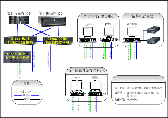 湖北省有線(xiàn)數字電視平臺節目存儲管理系統是為了解決數字節目收錄、播出、編輯、存儲而設計的一個(gè)以SAN結構為基礎的存儲網(wǎng)絡(luò )系統。