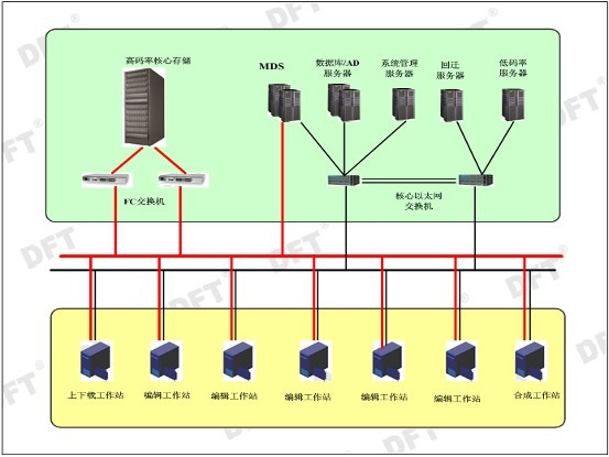 整個(gè)高清制作網(wǎng)系統平臺系統,建立在NAS+SAN的雙網(wǎng)結構之上,FC核心存儲,為整個(gè)系統的核心。
