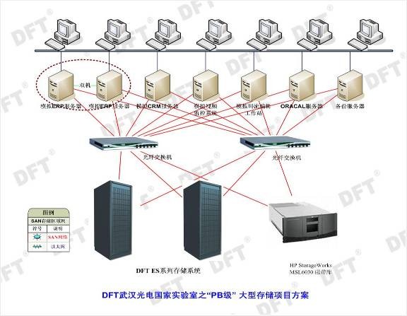 光電信息存儲研究部經(jīng)過(guò)對多家集成商的產(chǎn)品、技術(shù)和設計方案進(jìn)行詳細的論證和測試,最終選擇了深圳市迪菲特科技股份有限公司提供的產(chǎn)品和方案。該方案提供了FC-FC高端磁盤(pán)陣列DFT ES1600-FFx2一臺、FC-SATA高端磁盤(pán)陣列DFT ES 1600F-SATA八臺、Infiniband 24口10Gb高速交換機一臺、HP MSL6030磁帶庫一臺、以及相關(guān)的SAN存儲連接件和總容量超過(guò)1000000GB(約1PB)的各類(lèi)磁盤(pán)。整個(gè)方案以SAN為構架,關(guān)鍵應用主機到磁盤(pán)陣列及擴展箱全部采用端到端的雙鏈路冗余連接,FC-FC盤(pán)陣和Infiniband交換機作為高性能存儲的性能極限測試,8臺FC-SATA由于具備極佳的配置靈活性,可以組合成多種類(lèi)型的存儲體系而滿(mǎn)足不同類(lèi)型的應用需求,特別適合開(kāi)展是網(wǎng)絡(luò )和流媒體應用研究。HP MSL6030磁帶庫用于研究數據和實(shí)驗環(huán)境的備份恢復,大量的SAN存儲連接件和各類(lèi)磁盤(pán)為實(shí)驗室同時(shí)開(kāi)展多項研究測試提供了極大的便利。