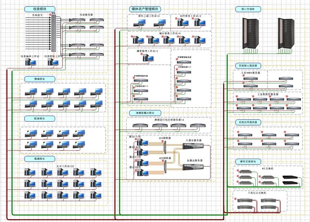 該方案設計以DFT存儲為核心,作為數據的存儲和交互平臺。在此基礎上承載了電視臺的所有數據業(yè)務(wù),包括收錄子系統、制作子系統、媒體資產(chǎn)管理子系統、新聞子系統、演播室子系統、播出子系統等。