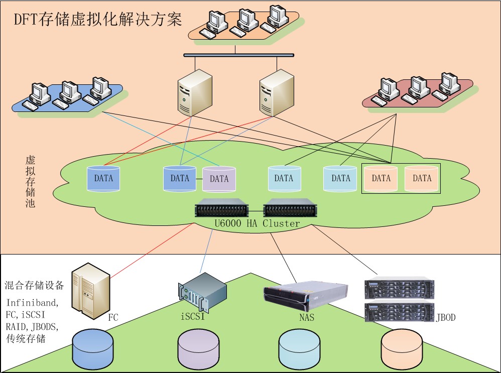 這一系列問(wèn)題的一個(gè)辦法,便是在用戶(hù)端電腦與存儲之間插入一個(gè)虛擬層,透過(guò)虛擬層的中介來(lái)管理前后端的存取連接。NS U6000系列是DFT最新推出的一款適用于中高端集群存儲應用需求的功能豐富的網(wǎng)絡(luò )存儲設備。該產(chǎn)品在同一存儲平臺中,既提供了文件級存儲的NAS功能,同時(shí)也提供數據塊級別的IP-SAN或FC-SAN存儲架構,其功能的多樣性使得用戶(hù)的前期投入成本得到了保護。NS U6000系列提供了可視化圖形管理界面,操作簡(jiǎn)單易于管理,其高性能、靈活性及高可靠性完全滿(mǎn)足用戶(hù)對數據及文件存儲性能的要求。該產(chǎn)品主要適用于高性能運算,大型視頻監控、大、中非編網(wǎng)、IPTV、VOD點(diǎn)播等應用。