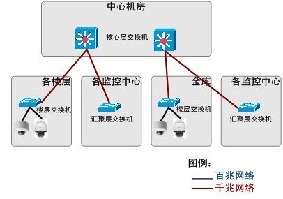 1)接入層交換機放置在各樓層弱電間(弱電井)中,其前端接入本層IP攝像機,并將信號傳送到中心機房的核心交換機;