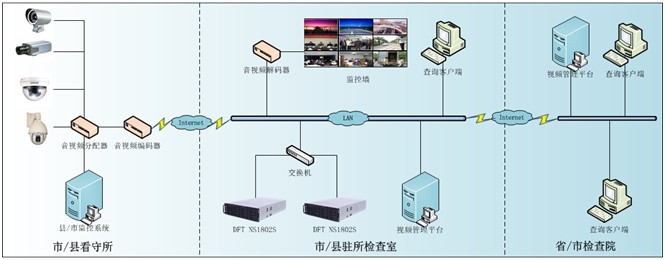 隨著(zhù)信息化的進(jìn)一步提升,為保證檢察系統的公平、公正、公開(kāi)的原則,安徽省檢察系統建立省、市、縣三級統一視頻監控聯(lián)網(wǎng)系統,實(shí)現上級單位對任意看守所實(shí)時(shí)圖像和錄像的調看。本項目中,DFT公司采用78套NS-1802S存儲系統,覆蓋省檢察院、地市檢察院、市縣檢察院共78所檢察室。接受來(lái)自于前端約10000多個(gè)槍機的視頻采集,約合視頻存儲空間:1150TB。