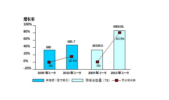 IDC(美國國際數據公司)的《中國企業(yè)級外部存儲市場(chǎng)季度跟蹤報告》顯示,2010年前三個(gè)季度(1-9月)中國企業(yè)級外部存儲市場(chǎng)的總規模達到685.7百萬(wàn)美元,同比增長(cháng)18.4%;存儲總容量達到480102.2TB,同比增長(cháng)80.9%。另IDC還估計2011年的企業(yè)級外部存儲市場(chǎng)的增長(cháng)會(huì )超過(guò)15%。