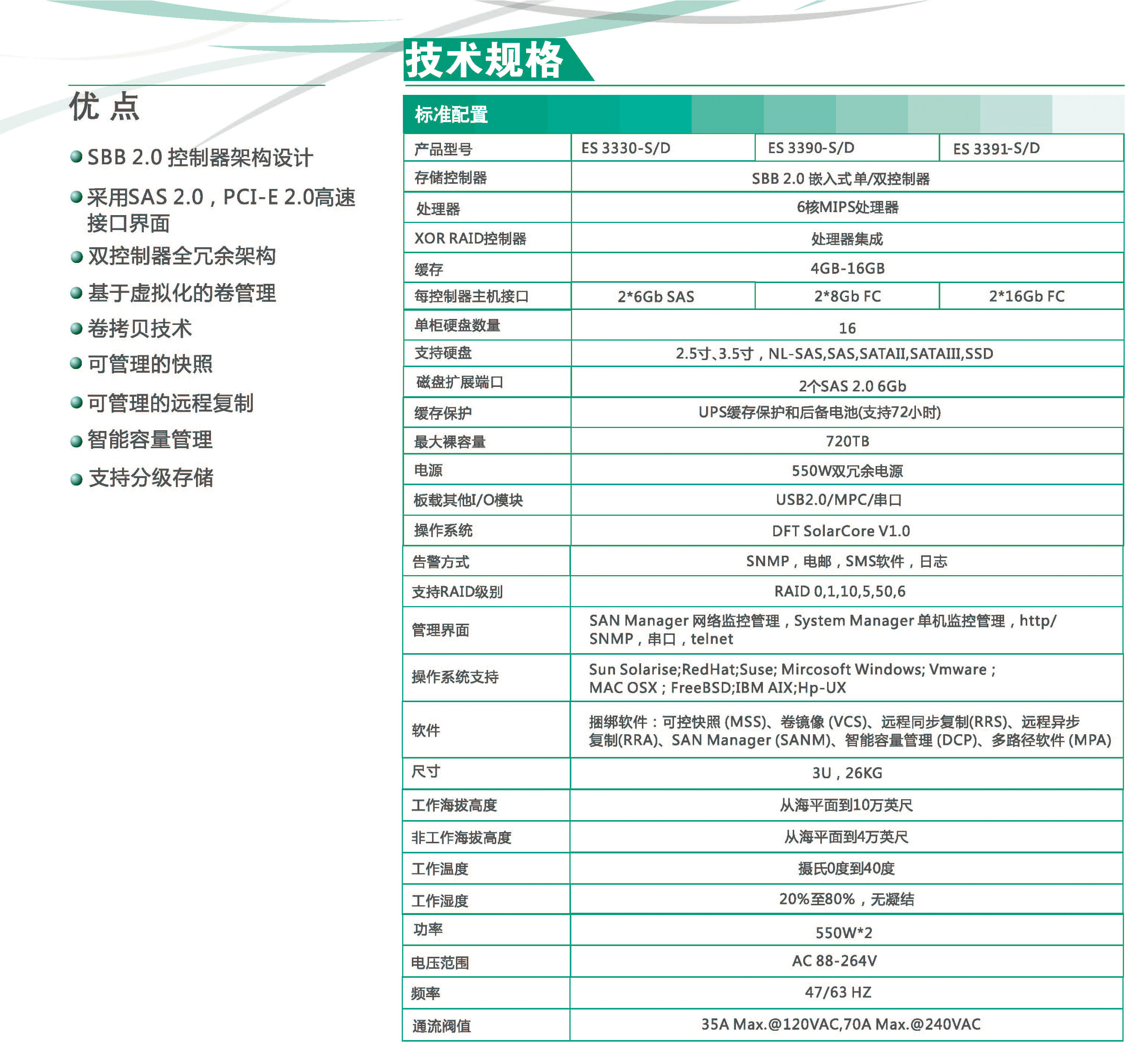 捆綁軟件:可控快照 (MSS)、卷鏡像 (VCS)、遠程同步復制(RRS)、遠程異步復制(RRA)、SAN Manager (SANM)、智能容量管理 (DCP)、多路徑軟件 (MPA) |
